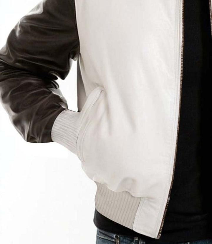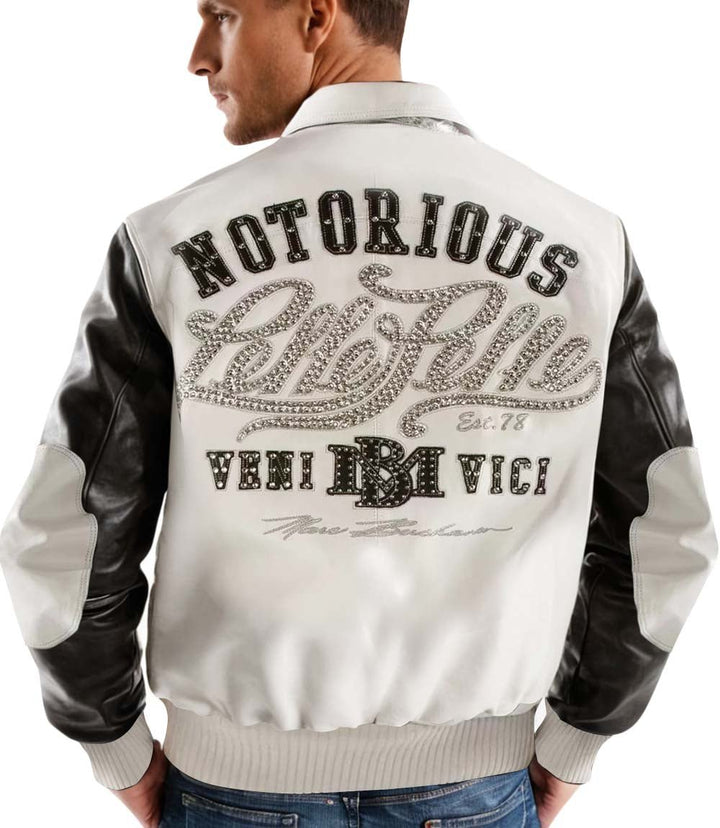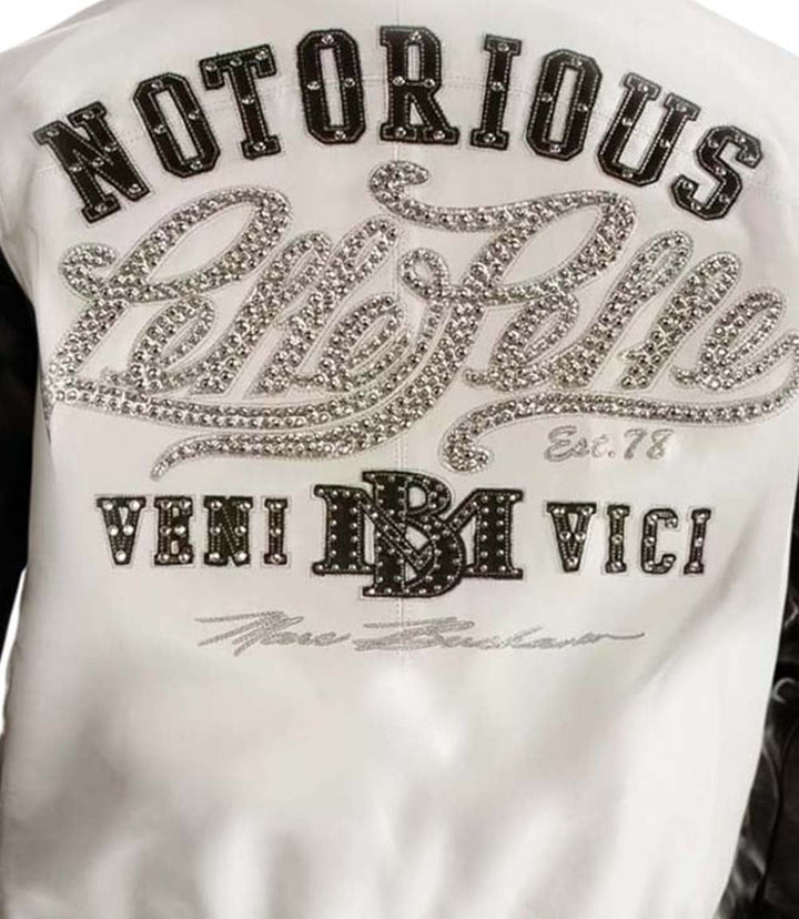 The Jacket in the photo is the Pelle Pelle "Notorious" leather bomber jacket Veni Vidi Vaci - a courageous and iconic design directly from the 90s and early 20 years of the 21st century. This White Pelle Pelle Jacket, made of first-class leather, has a sharp white body with contrasting black and white sleeves and adds this classic bomber silhouette with a high-impact visual edge. The rear show of detailed gems and embroidered works of art, including "Notorious," Pelle Pelle's signature script, "Vidi Vaci," and Marco Buchanan's autograph, creates this piece of real honor of the brand's inheritance. Ribbed cuffs, collar, and waist provide comfort and structure, while inner lining (usually quilted or satin) offers style and heat. Whether you are a vintage collector or want to turn heads, this Jacket is a pure statement.
