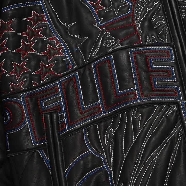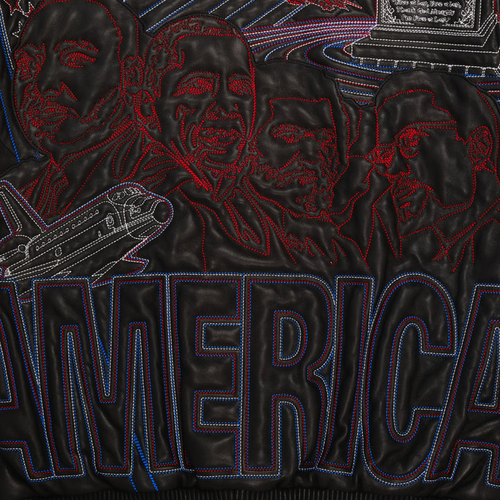 allover contrast color quilted america themed artwork and landmarks throughout the front, back and sleeves of the jacket