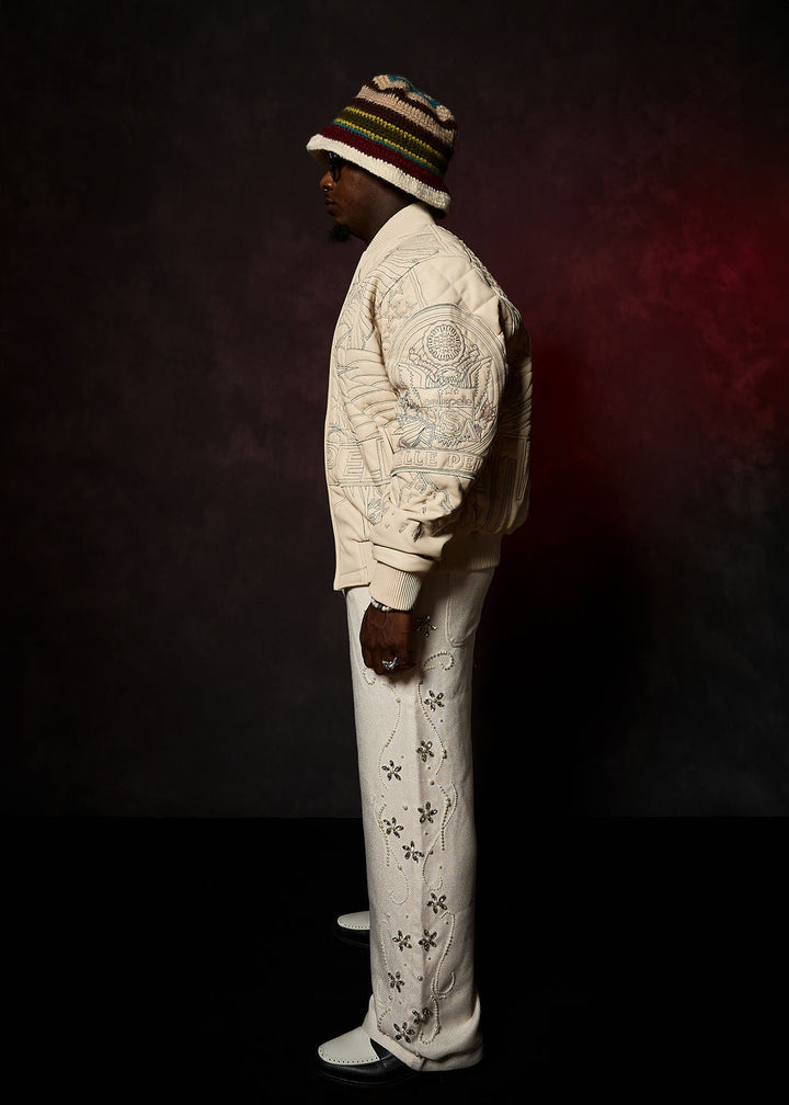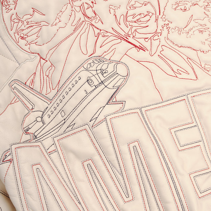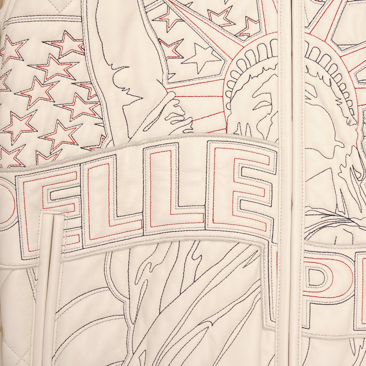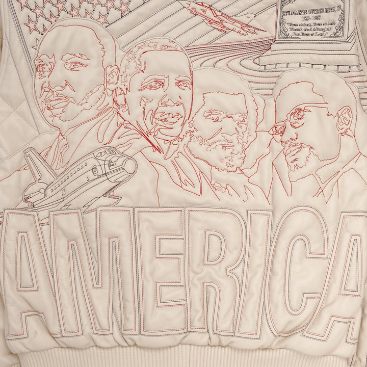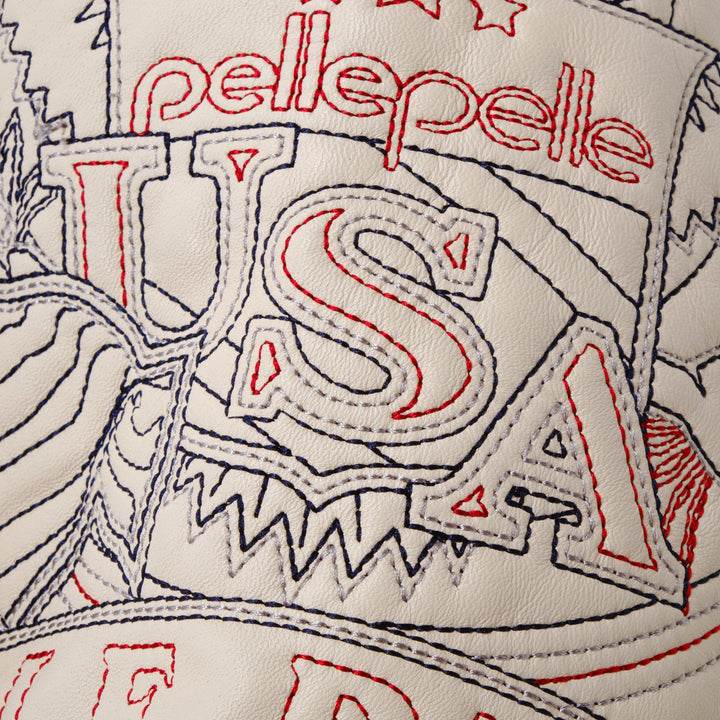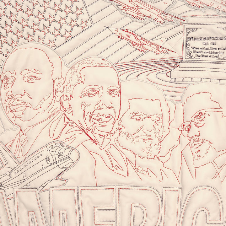 allover contrast color quilted america themed artwork and landmarks throughout the front, back and sleeves of the jacket