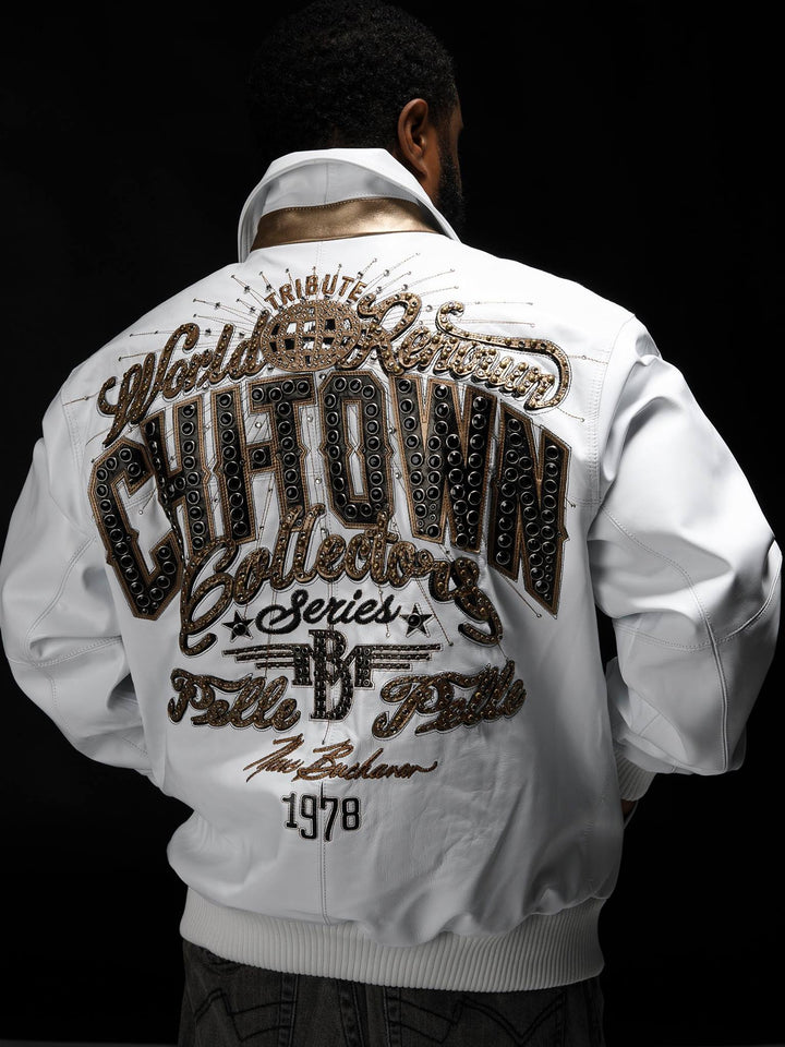 The Pelle Pelle Chi-Town White Leather Jacket is a masterpiece of urban fashion, combining sleek design with the rich cultural essence of Chicago. This iconic jacket features premium white leather adorned with bold Chi-Town embroidery, making it a standout addition to any wardrobe. Whether you’re strolling the streets or making a statement at an event, this jacket ensures you’re the center of attention.