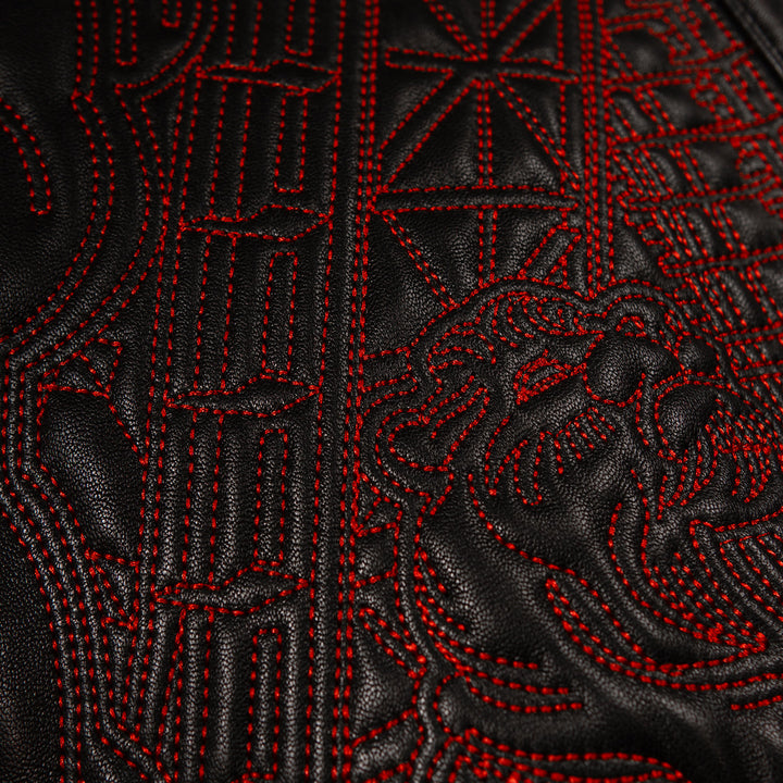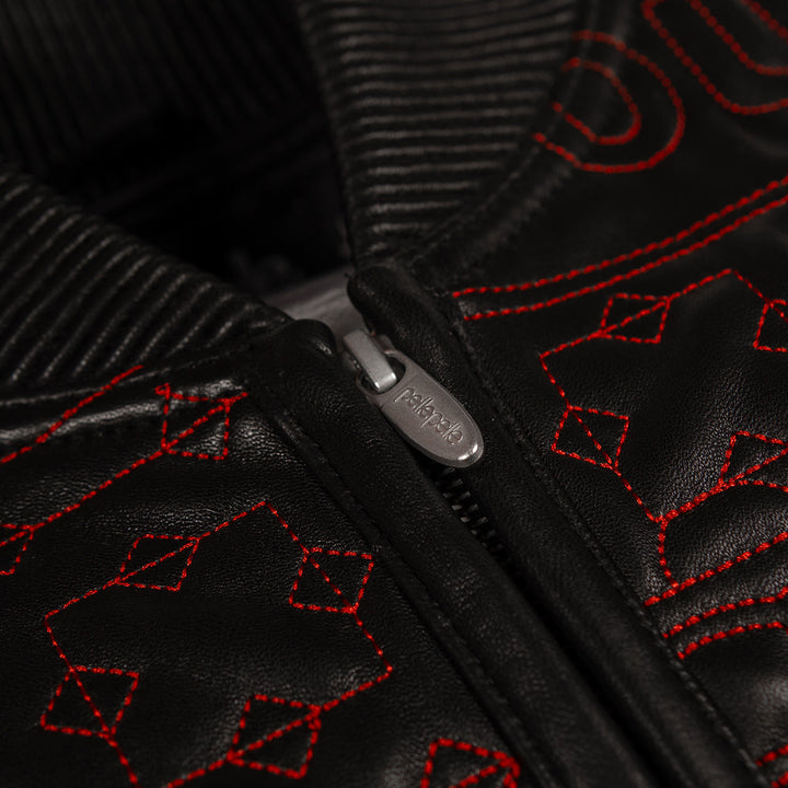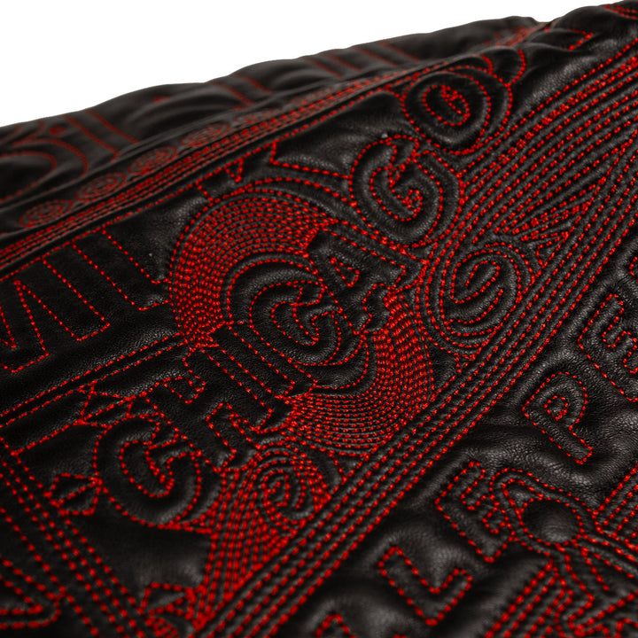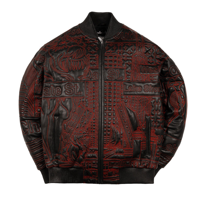 allover contrast color quilted chicago themed artwork and landmarks throughout the front, back and sleeves of the jacket