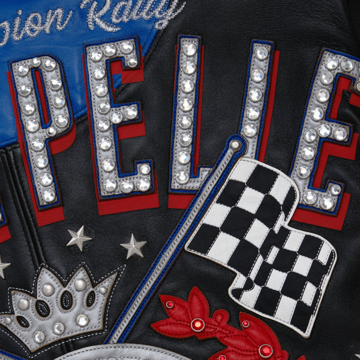 oversize pelle pelle checkered flag race graphic at the back with applied metallic leather and rhinestones