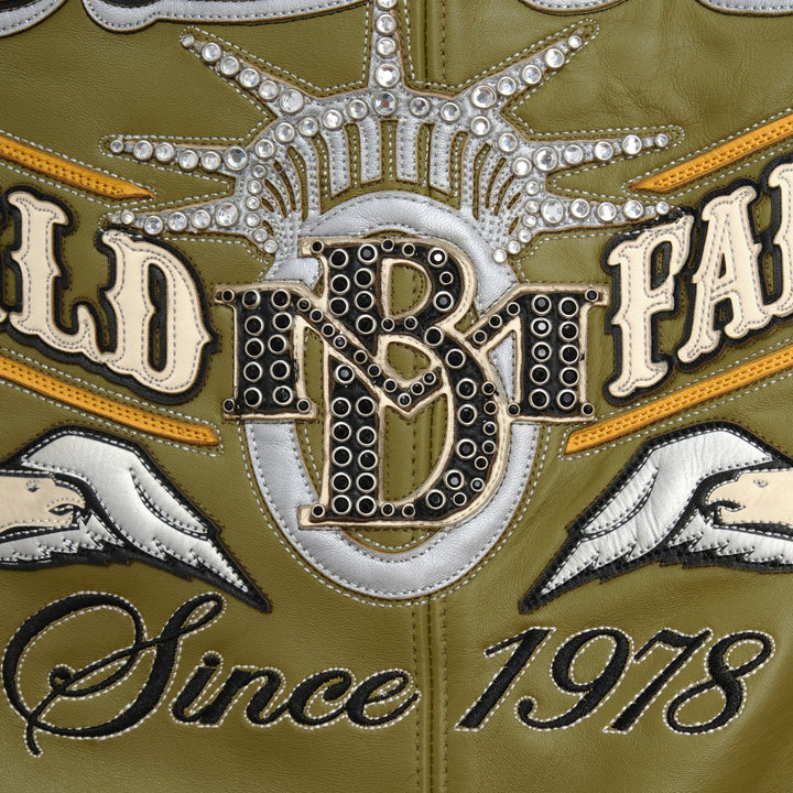 oversized pelle pelle home of the brave usa multi layered leathered artwork with rhinestones and metallic leather and stitching at the back of the jacket