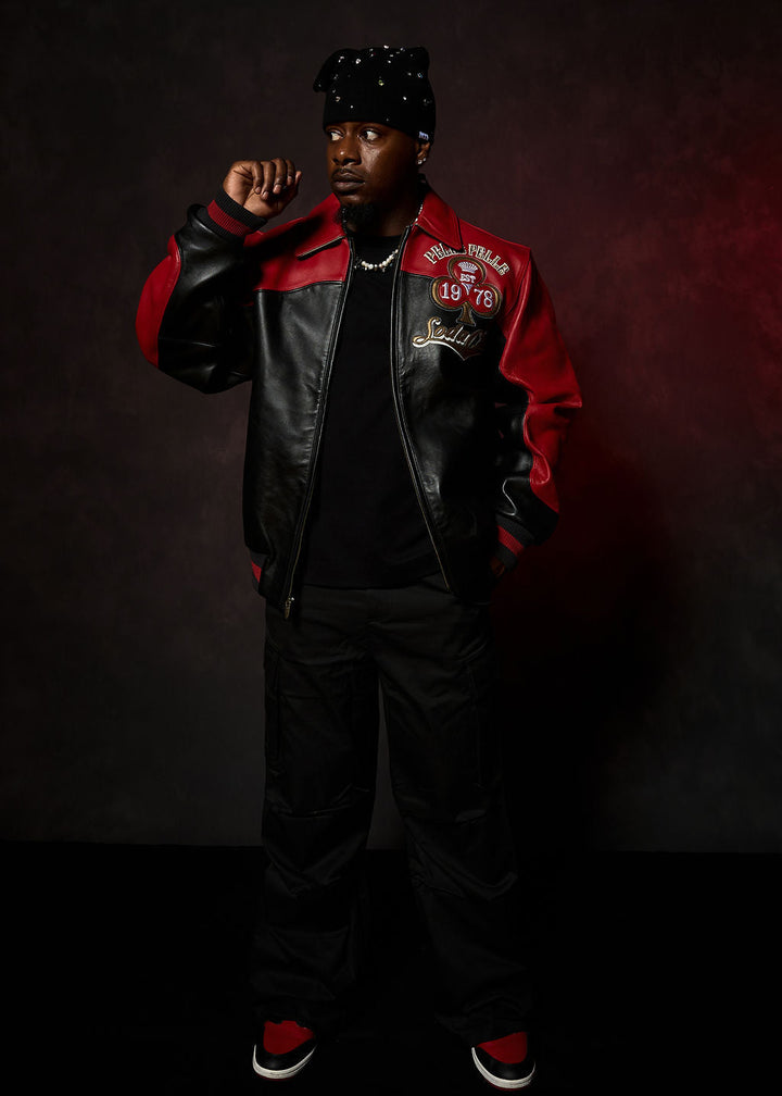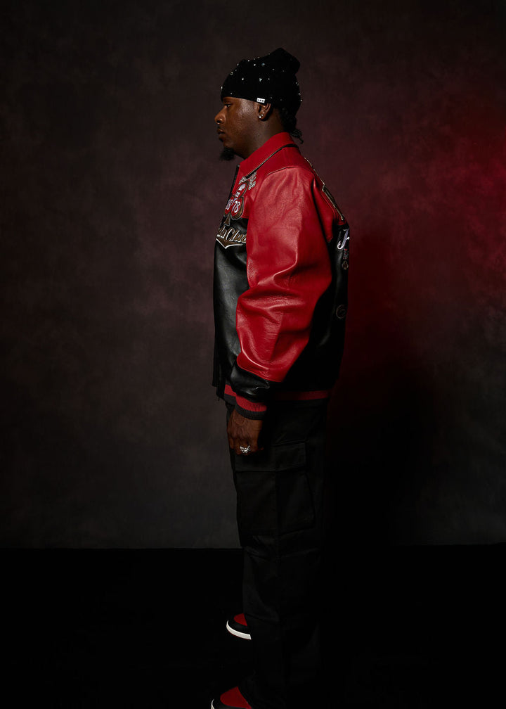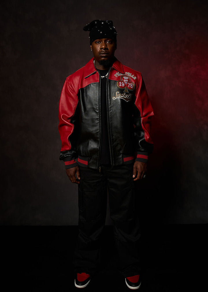 raised neoprene backed leather pelle pelle soda club edition artwork athe the wearer's left chest
