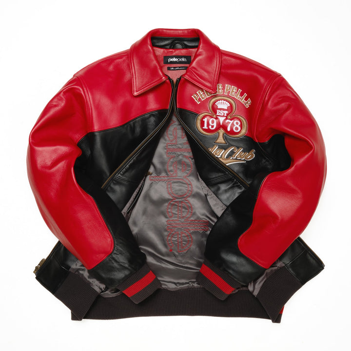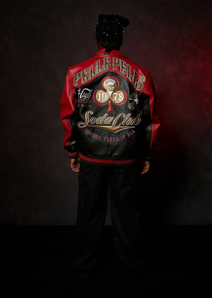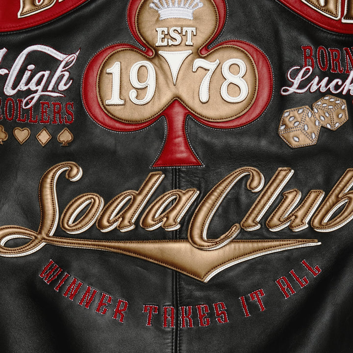 casino themed oversized pelle pelle "winner takes all" artwork with metallic leather and stitching at the back of the jacket