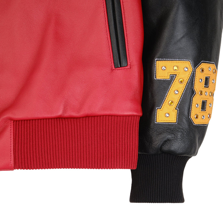 -Applied contrast color leather striping on the right sleeve
